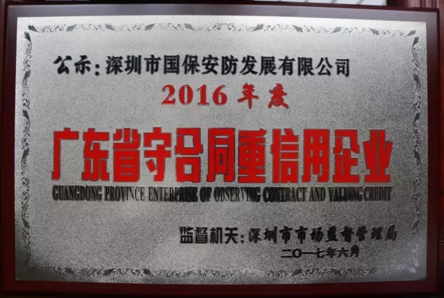 近日,在深圳市市場監督管理局開展的“守合同重信用企業”評選活動中,國保安防集團子公司“深圳市國保安防保安服務有限公司”和“深圳市國保安防發展有限公司”分別榮獲“2016年度廣東省守合同重信用企業”,這是繼“3A信用等級”、“誠信示范單位”之后,集團在誠信體系建設方面獲得的又一殊榮,集團信譽和品牌形象得到了進一步提升。