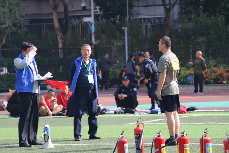 國保安防隊員們在消防技能比賽前的檢查與準備