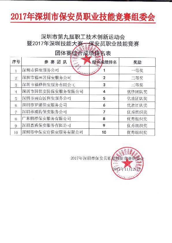 國保安防榮獲深圳市保安員職業技能競賽團體賽第四名!