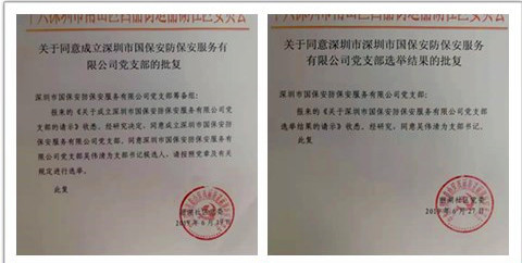 會議期間,吳偉清黨支部書記宣讀了《關于同意成立深圳市國保安防保安服務有限公司黨支部的批復》、《關于同意深圳市國保安防保安服務有限公司黨支部選舉結果的批復》及《加強深圳市保安行業黨建工作的實施意見》等三份文件。
