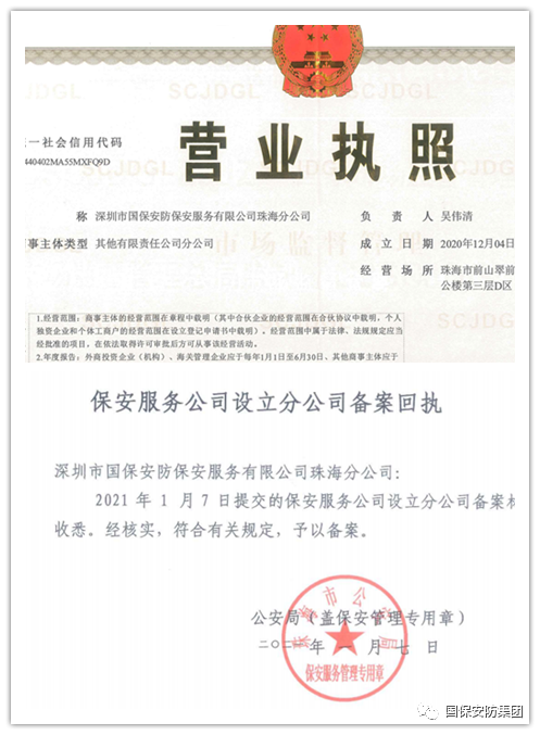 在珠海市政府、公安機關等有關單位的關心指導下,保安服務公司珠海分公司于2020年12月4日成立,先后取得營業(yè)執(zhí)照及分公司備案等經(jīng)營資質(zhì),至2021年3月19日,分公司人員組織機構、辦公室規(guī)劃、業(yè)務發(fā)展等全面建設工作已基本完善。