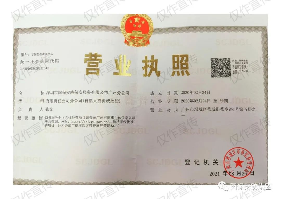 廣州分公司于2020年2月24日成立至今,在廣州市政府、公安機關等有關單位部門的關心指導下,相繼取得營業執照、分公司備案等經營資質,基于此,公司對外積極開拓業務、優質服務客戶,對內緊跟集團公司腳步、完善組織機構、營造良好辦公環境,不斷向保安行業服務更加專業化而努力,并且繼公司加入中國保安協會、廣東省保安協會、深圳保安協會等協會單位之后,成立同年7月份成功加入廣州保安協會成為第四屆理事會員單位,廣州分公司各項建設、業務發展日臻完善,成為支撐公司發展經營戰略布局的重要基石。