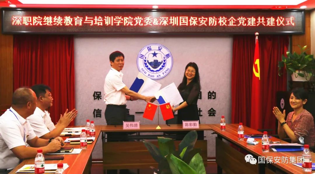 2022年6月17日下午,深圳國保安防集團與深職院繼續(xù)教育與培訓(xùn)學(xué)院黨委的黨建共建協(xié)議簽訂儀式順利舉行。深圳國保安防集團黨支部書記、董事長吳偉清與深職院繼續(xù)教育與培訓(xùn)學(xué)院黨委書記陳彩勤代表雙方簽約,雙方主要領(lǐng)導(dǎo)、黨員干部共計13人出席簽約儀式。