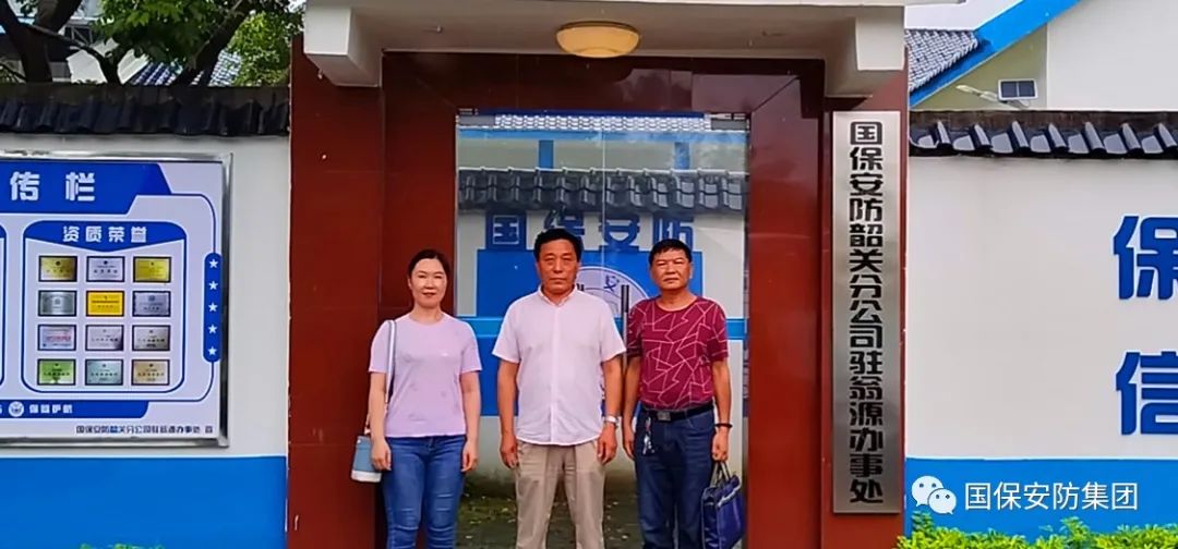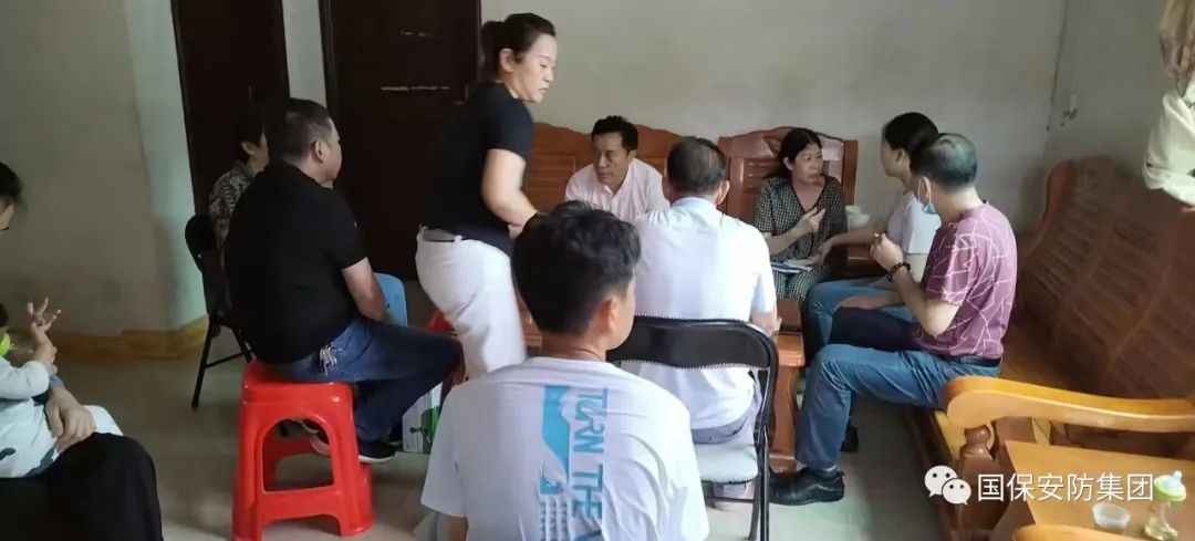 韶關(guān)分公司總經(jīng)理劉廣瑞(圖白色上衣)、湞江辦事處謝博云(圖女士)及翁源辦事處胡遠明(圖紅色上衣)研究部署近期安保工作
