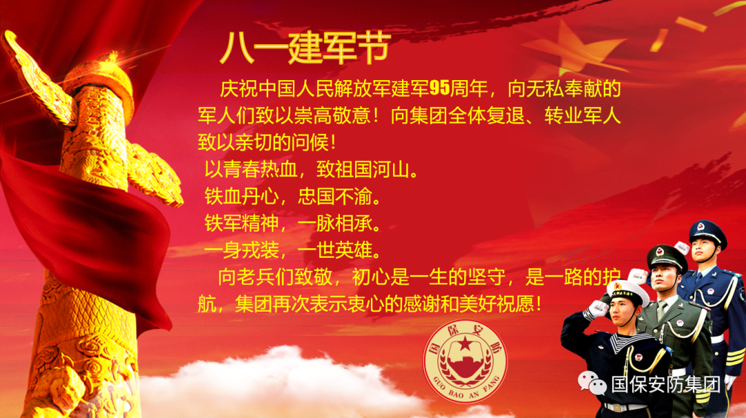 慶祝中國人民解放軍建軍95周年,向無私奉獻的軍人們致以崇高敬意!向集團全體復退、轉業軍人致以誠摯的問候! 以青春熱血,護祖國河山。 鐵血丹心,忠國不渝。 鐵軍精神,一脈相承。 一身戎裝,一世英雄。 向老兵們致敬,初心是一生的堅守,是一路的護航,集團再次表示衷心的感謝和美好祝愿!